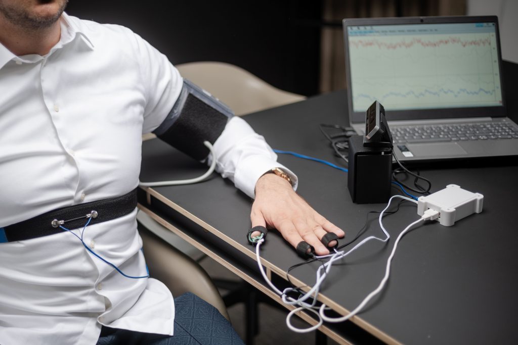 6. The person being tested is connected to the lie detector test device. This is a polygraph that can register several physiological processes and phenomena simultaneously. The device records several parameters, including pulse, respiration, skin resistance and temperature.